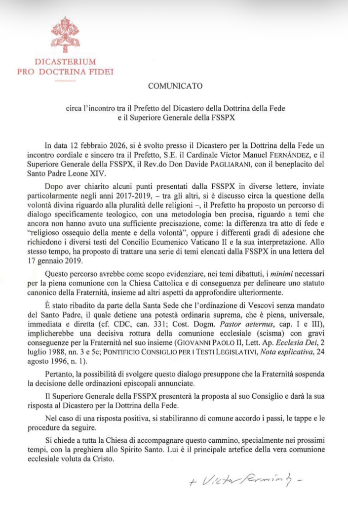 2026 február 12-én szívélyes és őszinte találkozóra került sor a Hittani Dikasztériumban a prefektus, Őeminenciája Víctor Manuel Fernández bíboros, valamint a Szent X. Piusz Papi Testvérület (SSPX) legfőbb elöljárója, főtisztelendő Davide Pagliarani atya között, Őszentsége XIV. Leó pápa jóváhagyásával.