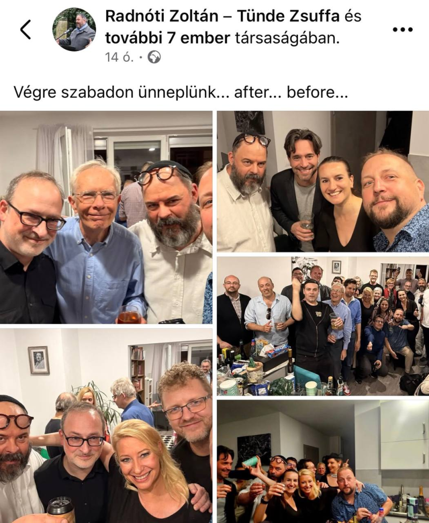 „Végre szabadon ünneplünk… after… before…” – ezzel a szöveggel tett közzé fotókat Radnóti Zoltán rabbi vasárnap a Facebookon. A bejegyzés kontextusából egyértelműen kiderül, hogy a szélsőségesen cionista, idehaza a balliberális oldallal kokettáló zsidó rabbi és elvbarátai a Tisza Párt választási győzelmét ünnepelték Gulyás Balázs újságíró otthonában.